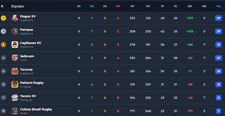 Tercero, con 31 tantos, está Capibaras tas superar a Cobras Brasil, el peor equipo del campeonato, 40 a 19 como visitante. Selknam de Chile consiguió una victoria más que importante frente a Yacaré XV de Paraguay 34 a 13 y escaló al cuarto lugar con 27 unidades, por lo que está en zona de ingreso a las semifinales.