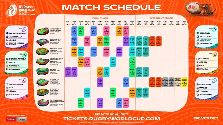 Los octavos de final se jugarán el 23 y 24 (a Los Pumas les toca Sydney como ganadores o segundos de zona), también de octubre; y los cuartos, el 30 y 31 (Argentina irá a Brisbane si llega a esta instancia). Ya en noviembre, y todo en Sydney, las semi serán el 5 y 6, el partido por el bronce, el 12, y la final, el 13.